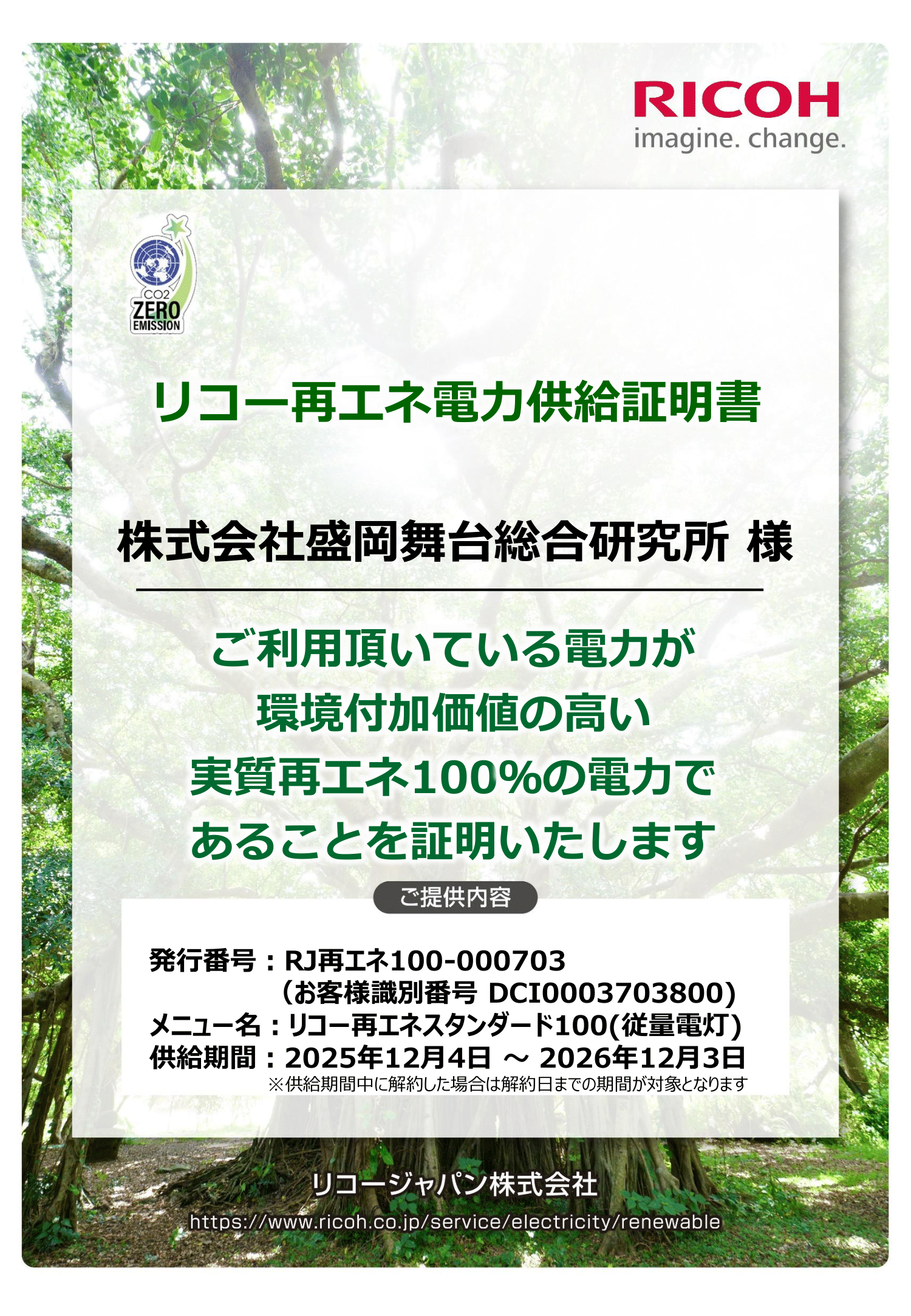 ※使用している再生可能エネルギーは、リコー再エネスタンダード100です。